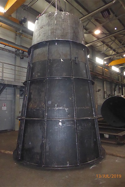 Levstal valmistas hüdroelektrijaama jaoks veel ühe spiraalkorpuse. Spiraalkorpus on kõrgema peaga turbiinidel, tavaliselt Francis’I disain. See on ristlõikega ümmargune ja ümbritseb kogu seadme perifeeriat. Valmistasime toorikud, tegime rull-painutamist, kokkupanekut, keevitamist, NDT juhtimist, värvimist ja tegelesime transpordiga.